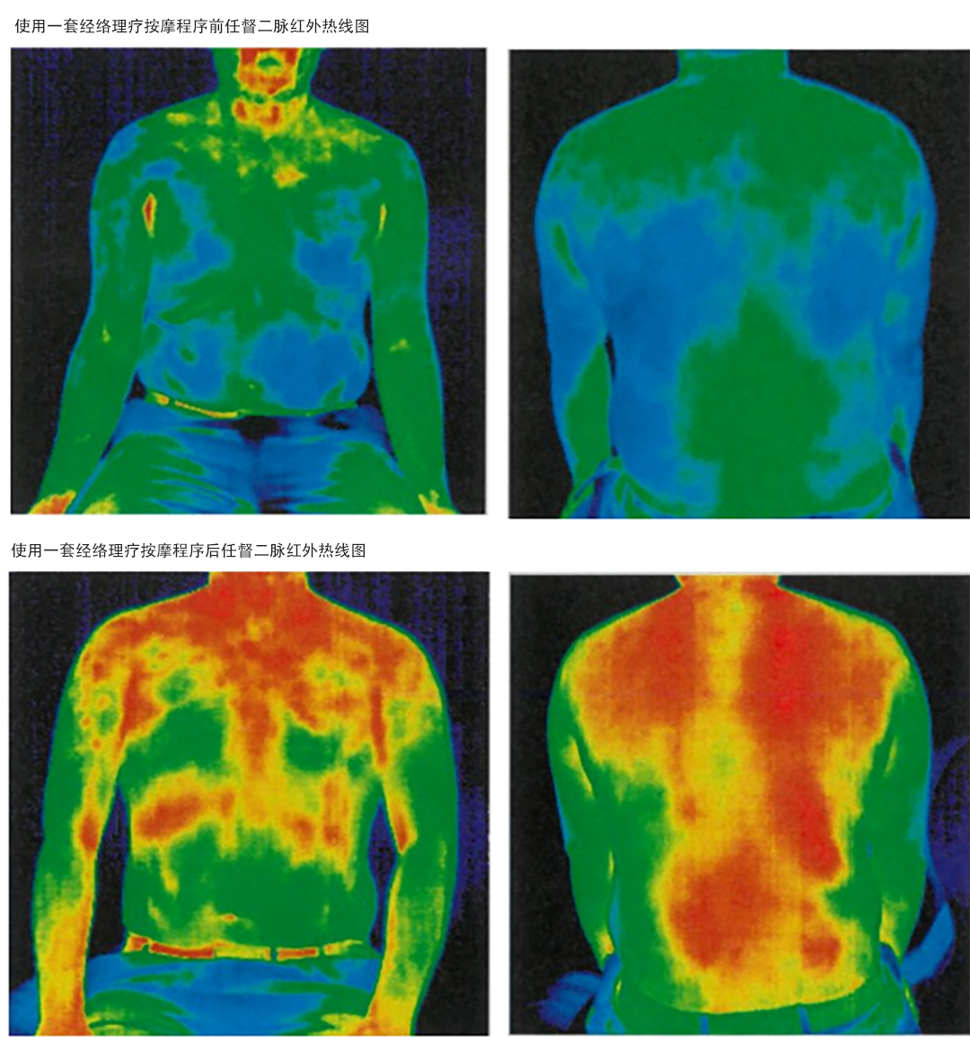 利用专业红外热像仪在使用一套完整荣耀按摩椅经络理疗按摩程序前后分别拍摄任督二脉的红外热像图。