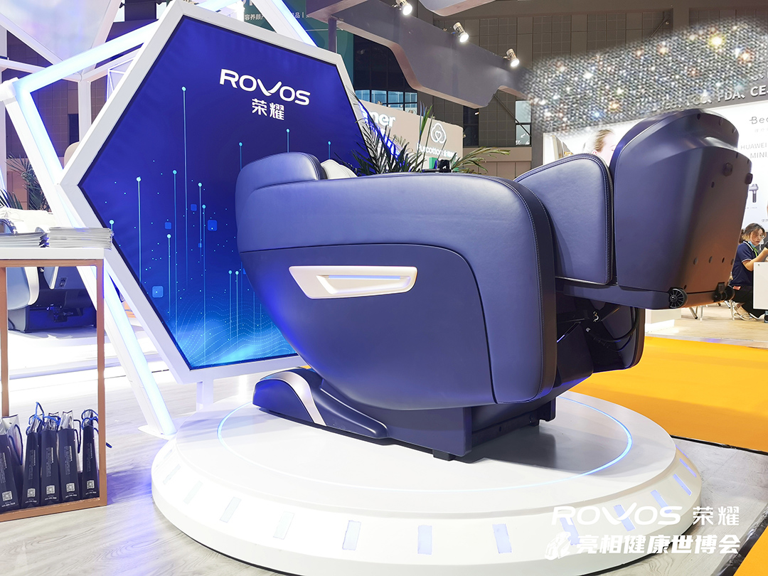 在ROVOS荣耀展位上,独占一个展示台,尽显高贵典雅的按摩椅便是ROVOS荣耀的旗舰机——R9800AI芯翊椅,无论从外观、功能配置还是产品性能,都呈现出荣耀最新技术运用和“最优之作”背后的精工匠心。