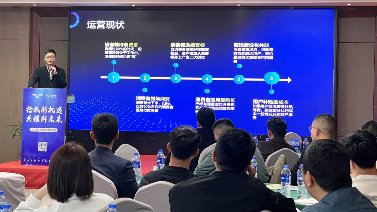 会议开始星云开物按摩椅事业部莫细富总监并就当前共享按摩椅行业运营现状及未来趋势提出了许多富有建设性的意见与建议,并从系统服务商的角度,以大数据为支撑,探讨了如何有效提高运营,让共享行业从单品向全品类互融发展。